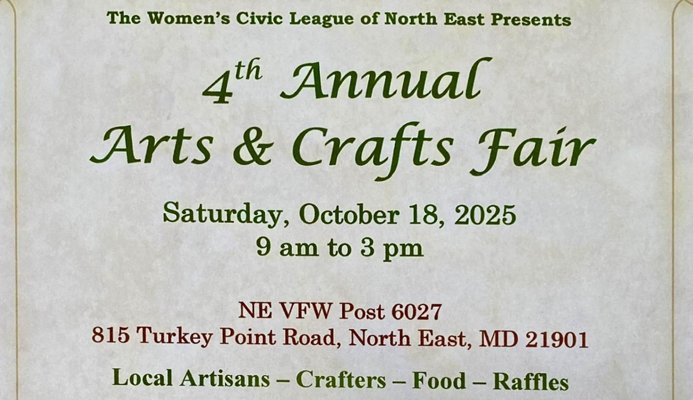 The Women’s Civic League of North East is presenting their 4th Annual Fall Arts & Craft Fair on Saturday, October 18, 2023 from 9am-3pm at the North East VFW Post #6027. Located at 815 Turkey Point Road, North East, MD 21901. Local Artisans, Crafters, Food and Raffles will be there!