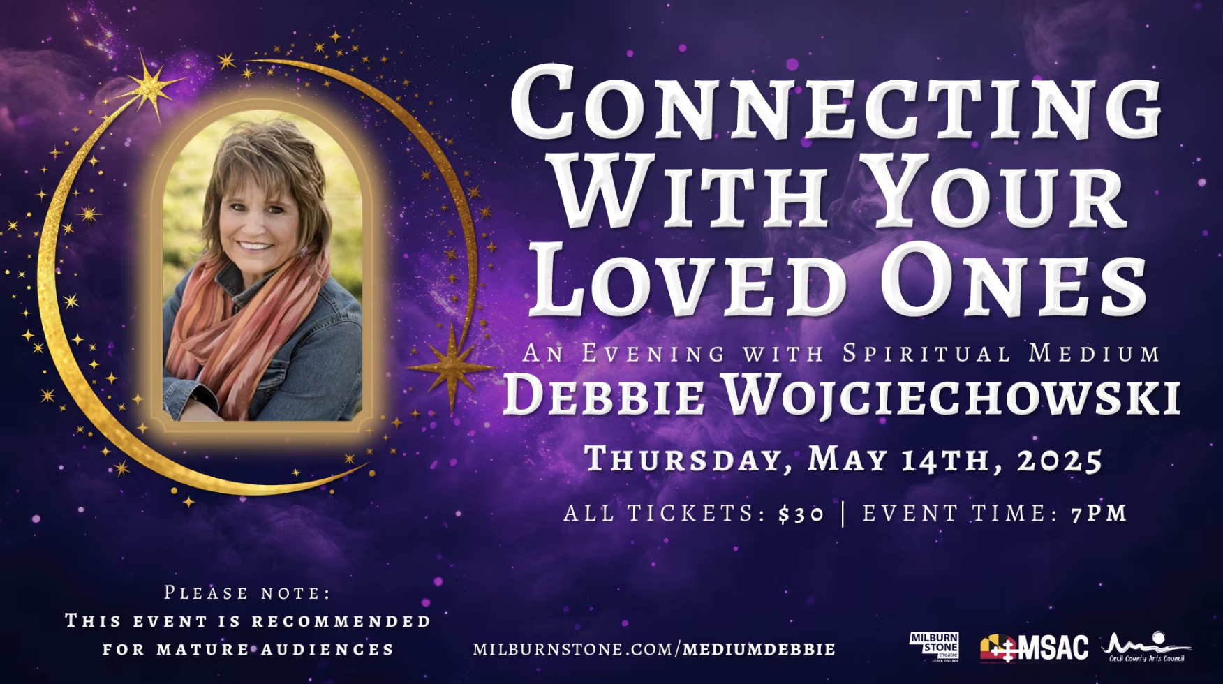 Back by popular demand, the Milburn Stone Theatre is honored to host “Connecting With Your Loved Ones,” An Evening with Debbie Wojciechowski, Spiritual Medium, on Thursday, May 14th, 2026, at 7 PM. Debbie, a nationally acclaimed and certified Evidential Medium, brings over 20 years of experience in connecting individuals with their loved ones on the other side. Her warm and compassionate approach has provided comfort and healing to many, delivering clear and accurate validations of spirit presence.