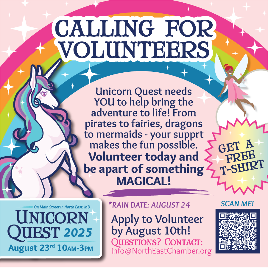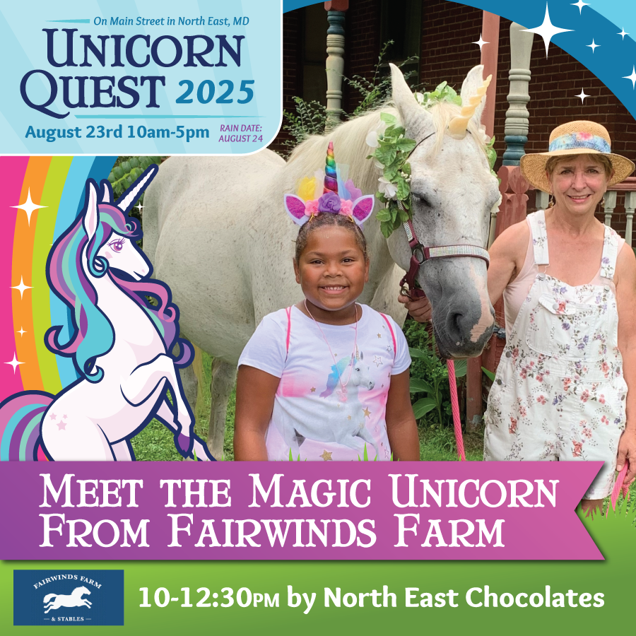Join us for the 8th Annual Unicorn Quest on Saturday, August 23, 2025 from 10am–3pm (Rain Date: August 24th) on Main Street in North East, MD. This FREE event has tons of fun for ALL AGES and lovers of all things magical. Questers earn gems to exchange for raffle tickets towards the Unicorn Quest Mystic Prize Basket by participating in activities and making purchases with Main Street Merchants and Outside Vendors. Come celebrate all things magical at Unicorn Quest!