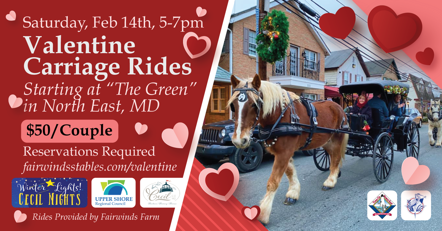 Enjoy a Valentine’s Day Horse Drawn Carriage Ride on Main Street in North East, MD on Saturday, February 14th between 5-7pm. Reserve your ride at fairwindsstables.com/valentine