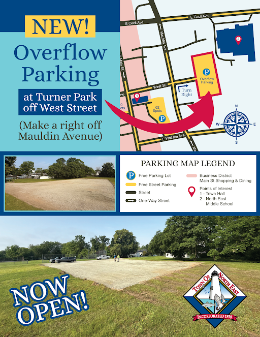 The Town of North East is excited to announce that Turner Park is now open for overflow parking! As we continue exploring efficient parking solutions and improving pedestrian connectivity, this marks a helpful step forward.
