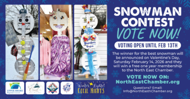 The 6th annual “Winter Lights, Cecil Nights” festival is from January 8 – March 19, 2026 in the Town of North East! This is a campaign to support our Main Street shops and restaurants (and chamber members) during the tough winter months. We’re lighting up the town, lifting community spirits, and creating compelling reasons for folks to come to North East, MD in winter. Come have winter-time fun with us!